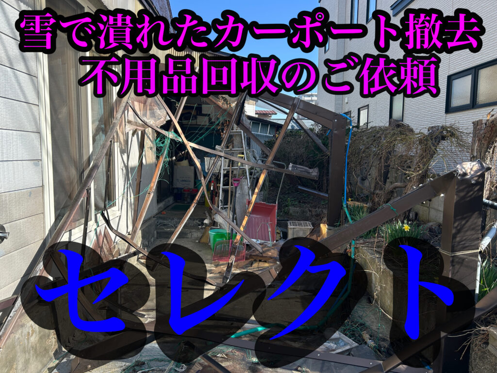 雪で潰れたカーポート撤去、庭木伐採、不用品回収のご依頼